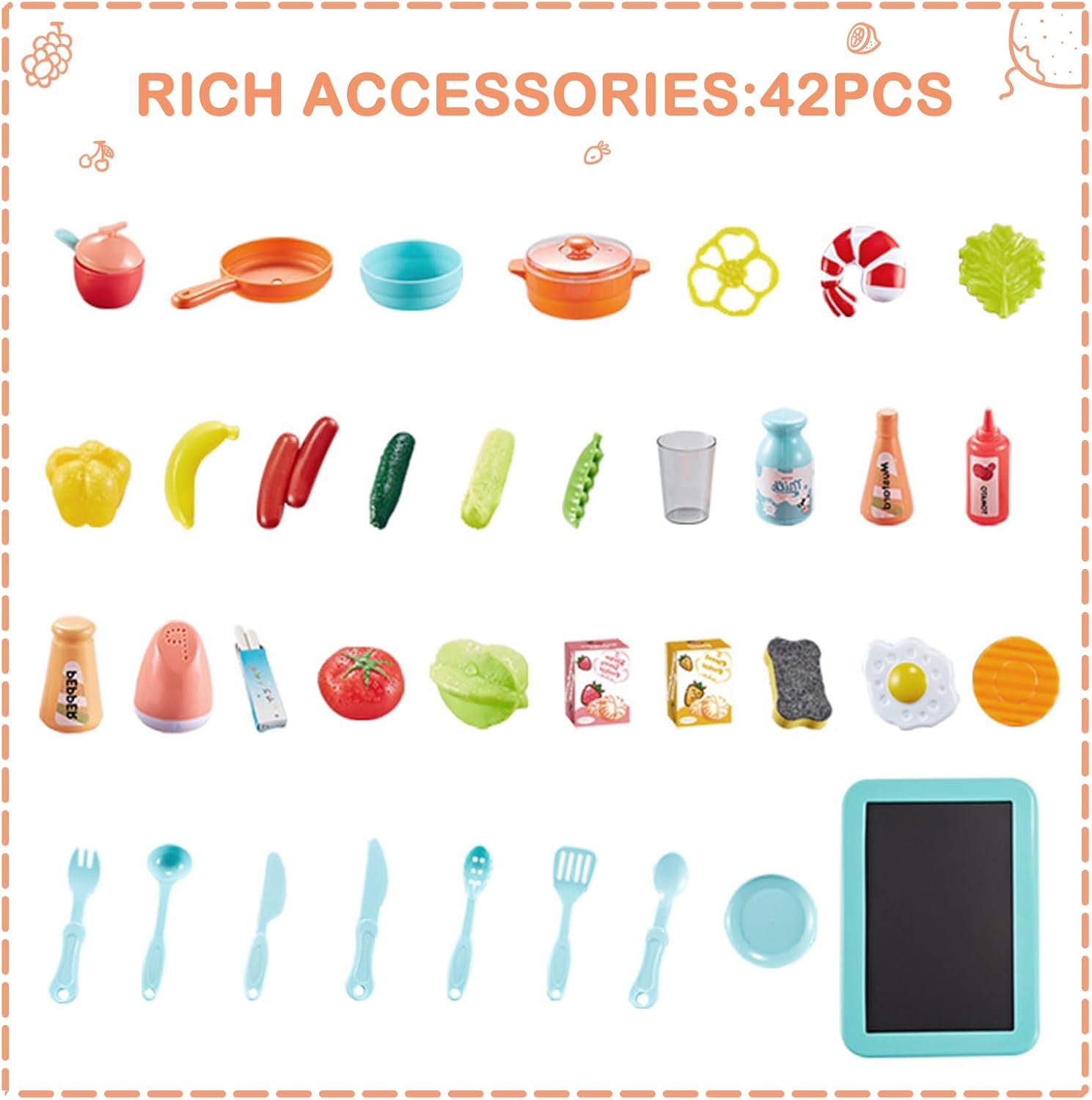 42PCS KIDS PLAY KITCHEN: The toddler kitchen playset includes a stove, sink, refrigerator, utensils, pots, pans, menu board, vegetables, fruits, and more, allowing kids to unleash their creativity in the kitchen. Pretend play kitchen measures 24.8inch×8.6inch×17.9inch.