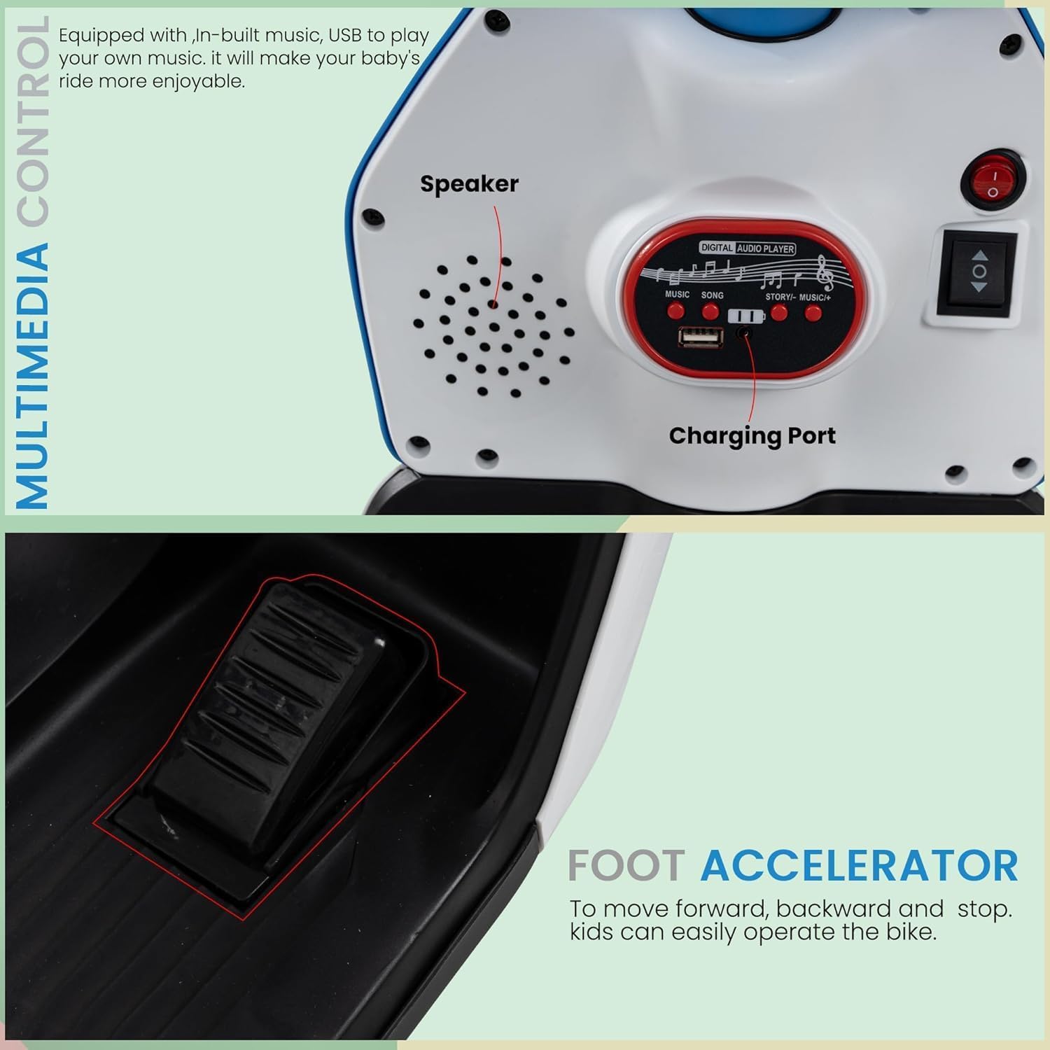 Engaging Interactive Features: This electric ride-on bike includes built-in music, a horn, and USB connectivity, allowing children to enjoy their favorite tunes while riding. The functional headlights and user-friendly forward/backward switches make every ride fun and exciting.