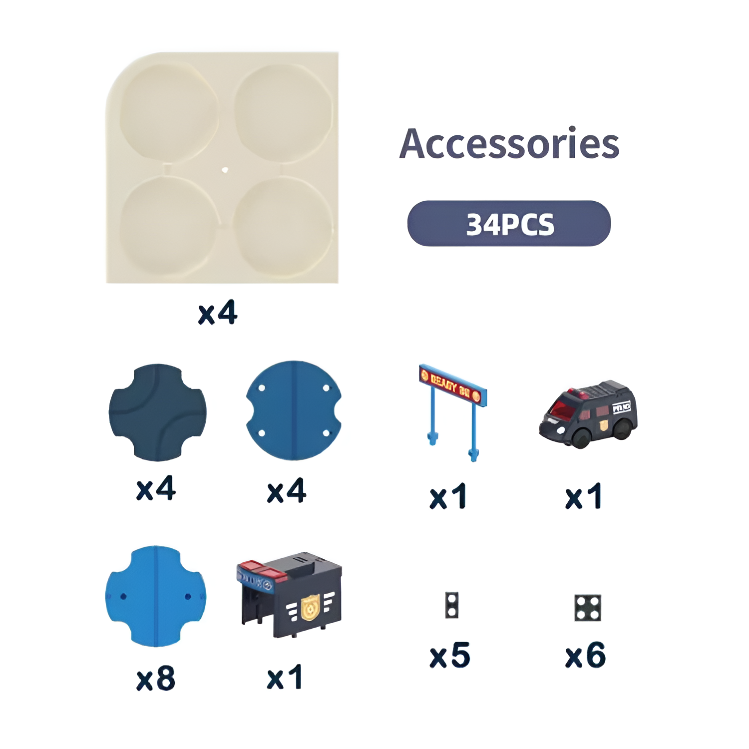 (34 Pieces) : Includes a diverse range of blocks, tracks, connectors, and accessories.
