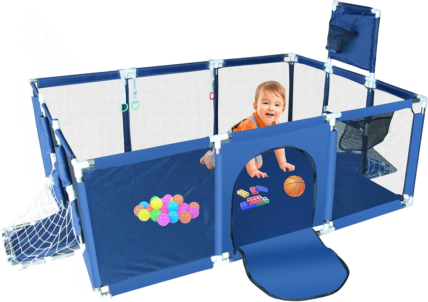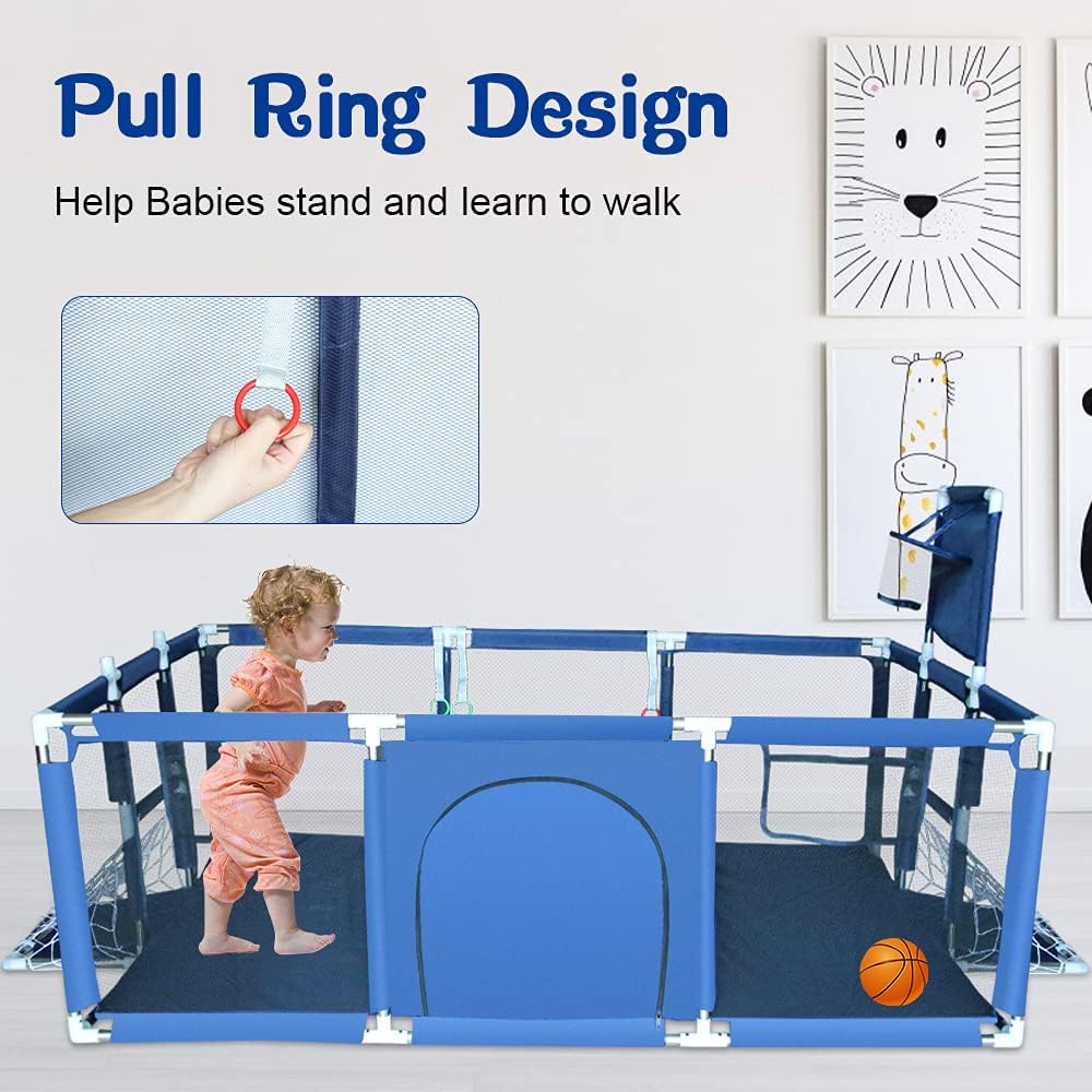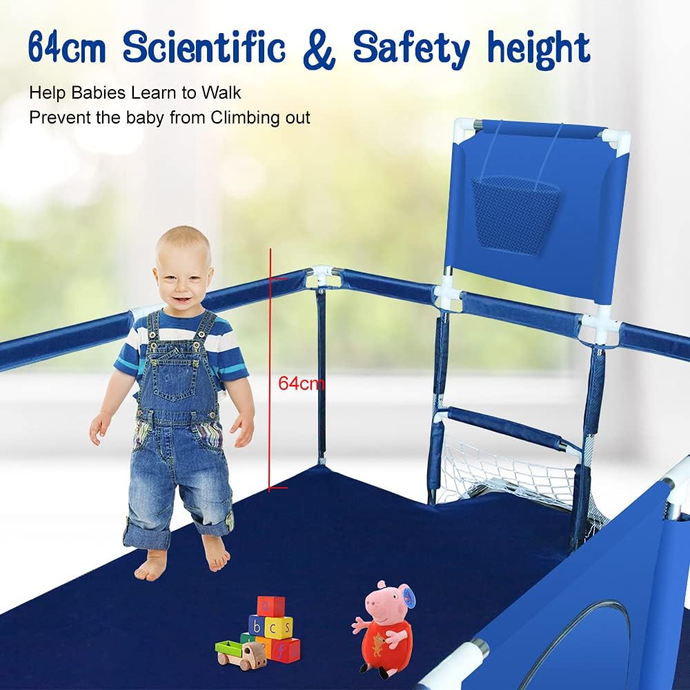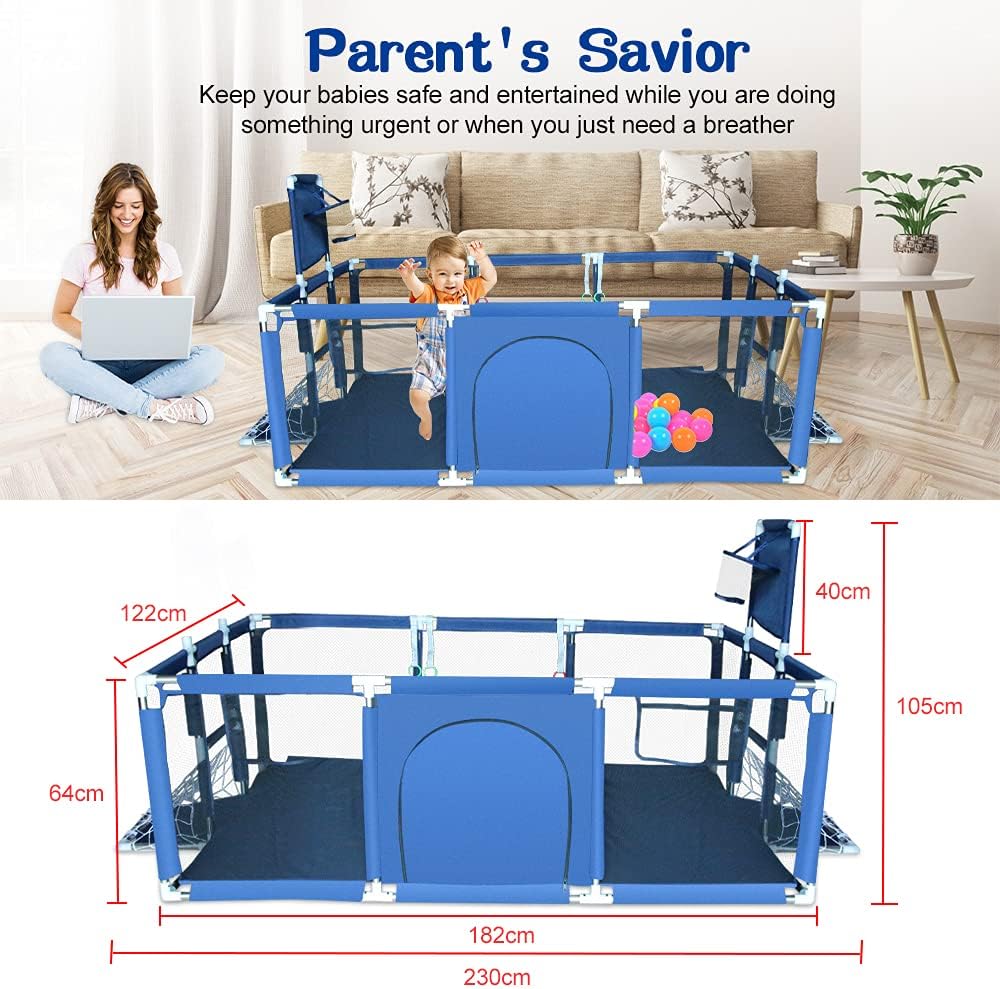 4、Large Play Area and Scientific Height: 122*182*66cm large space, safe play space for baby's feet. With basket design and football net design, babies can play by themselves, liberating their nature. The height of the fence is enough for babies to stand and walk, and there is enough space in the game pen to explore the surroundings.