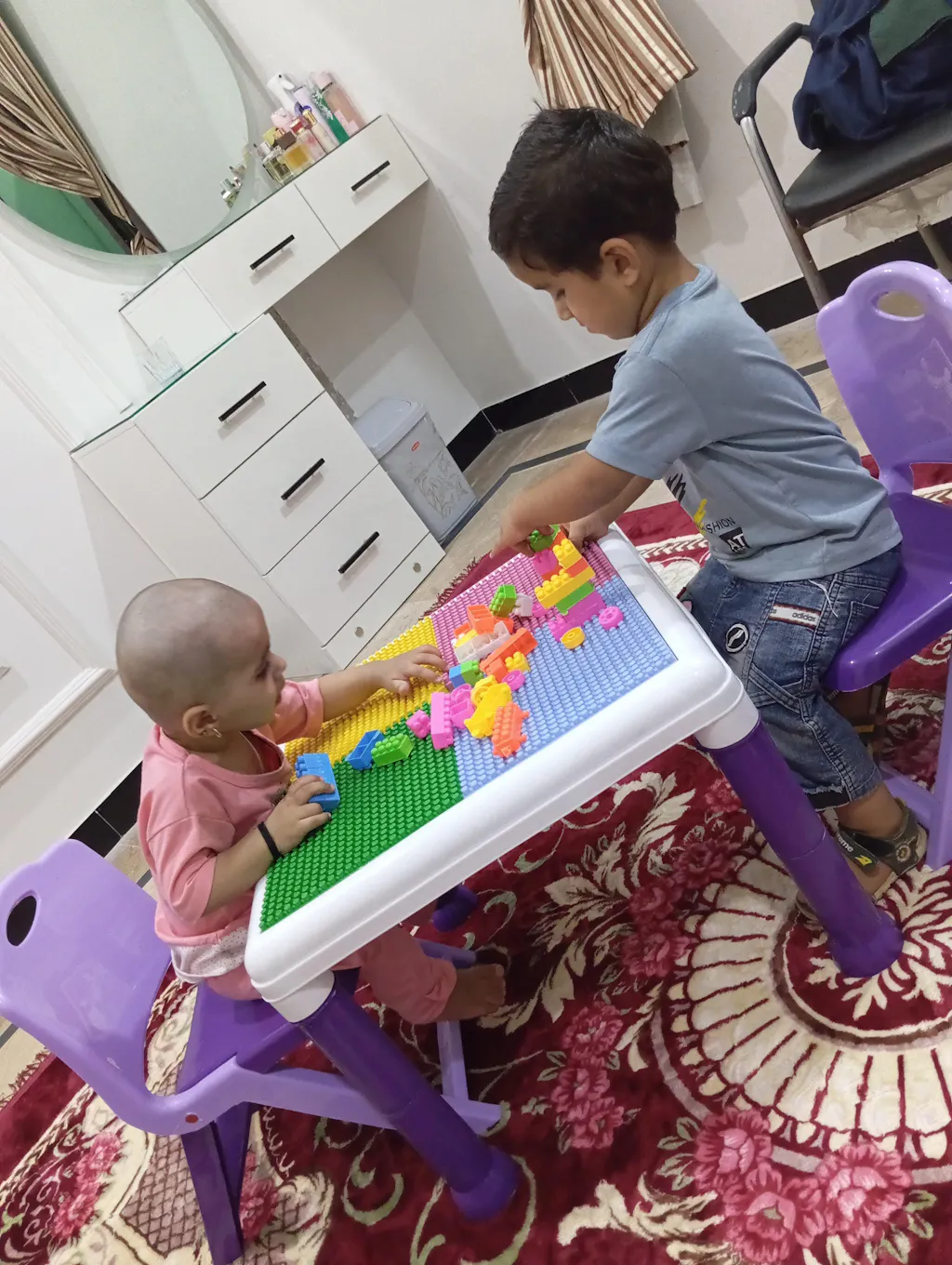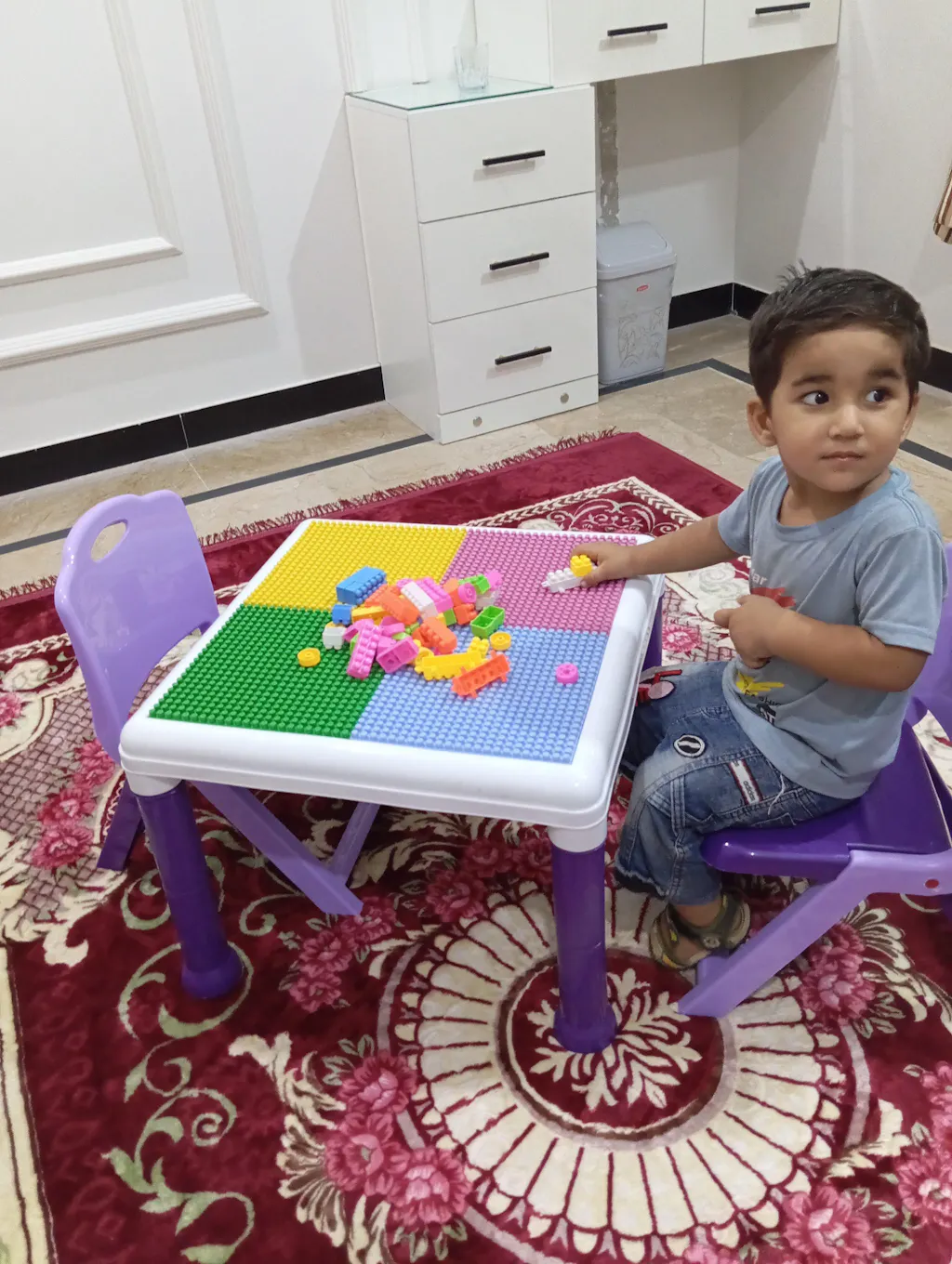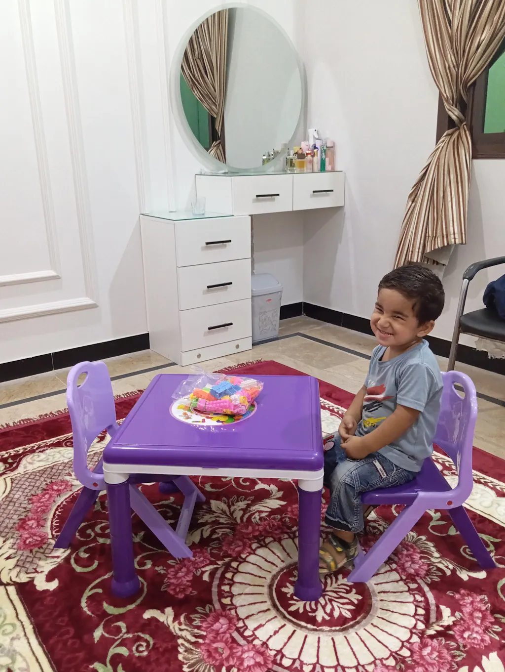 This kid's table and chair set features colorful graphics of Panda and their friends.
