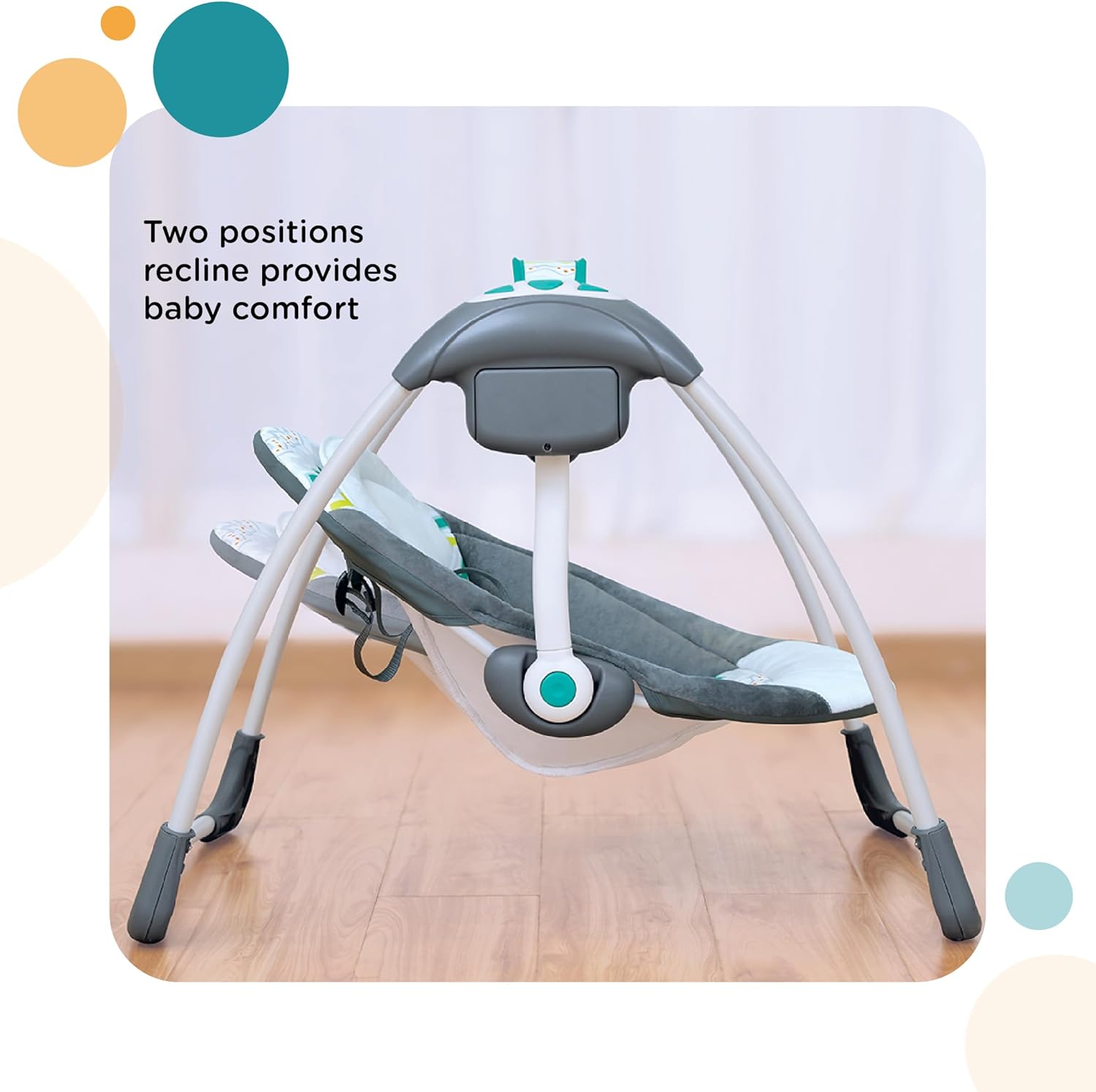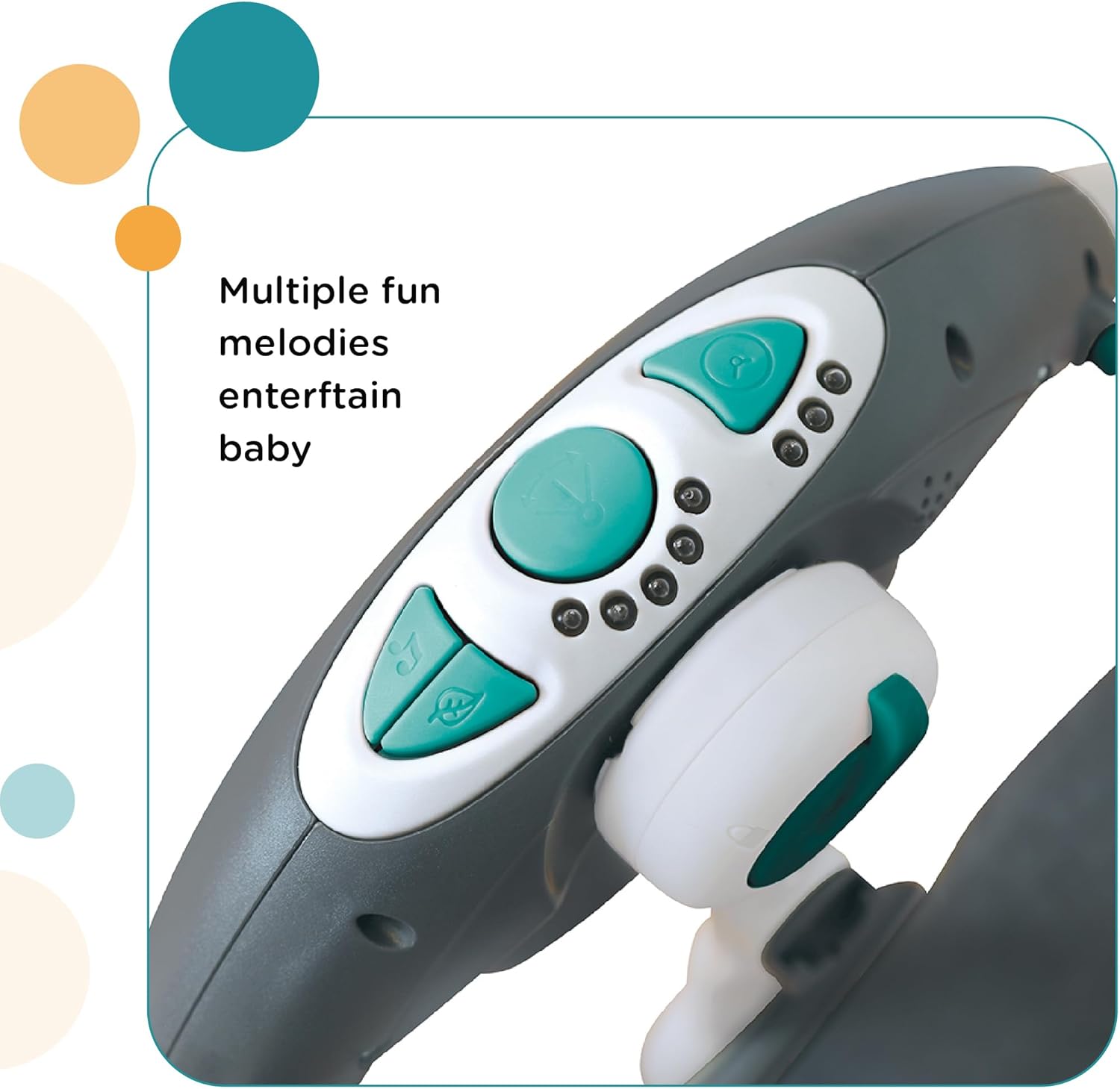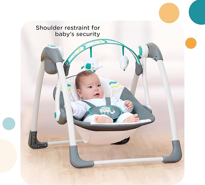 Swing features 5 swing speed. Swing has Plaything bar with 2 fun Playthings. Fun melodies keep baby entertained.